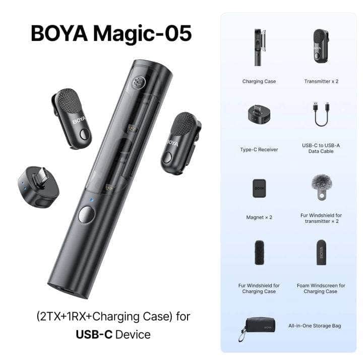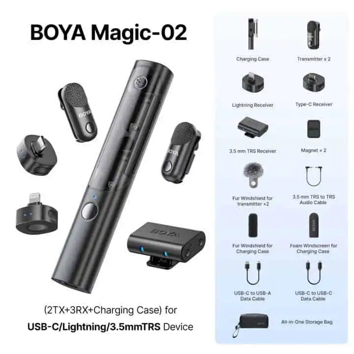 Designed for simple pairing out of the box and supporting up to two transmitters per receiver, the BOYA Magic Mini elevates your audio production with reliability, mobility, and professional-grade sound, perfect for interviews, presentations, and dynamic content creation.